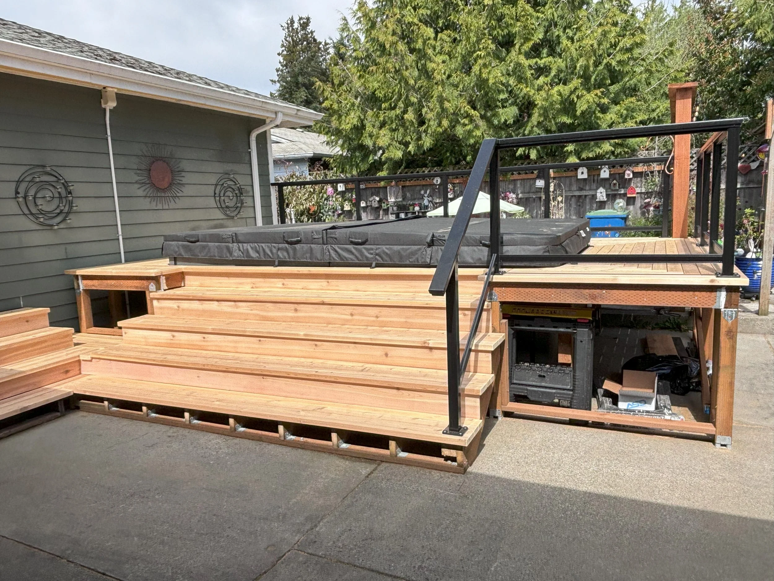 Enjoying the outdoors is crucial in the Northwest. This deck surrounding a swim spa provides easy access for little - and large - feet to play in the warm water. All cedar decking with cedar fence boards at the skirt, and an aluminum and glass rail.