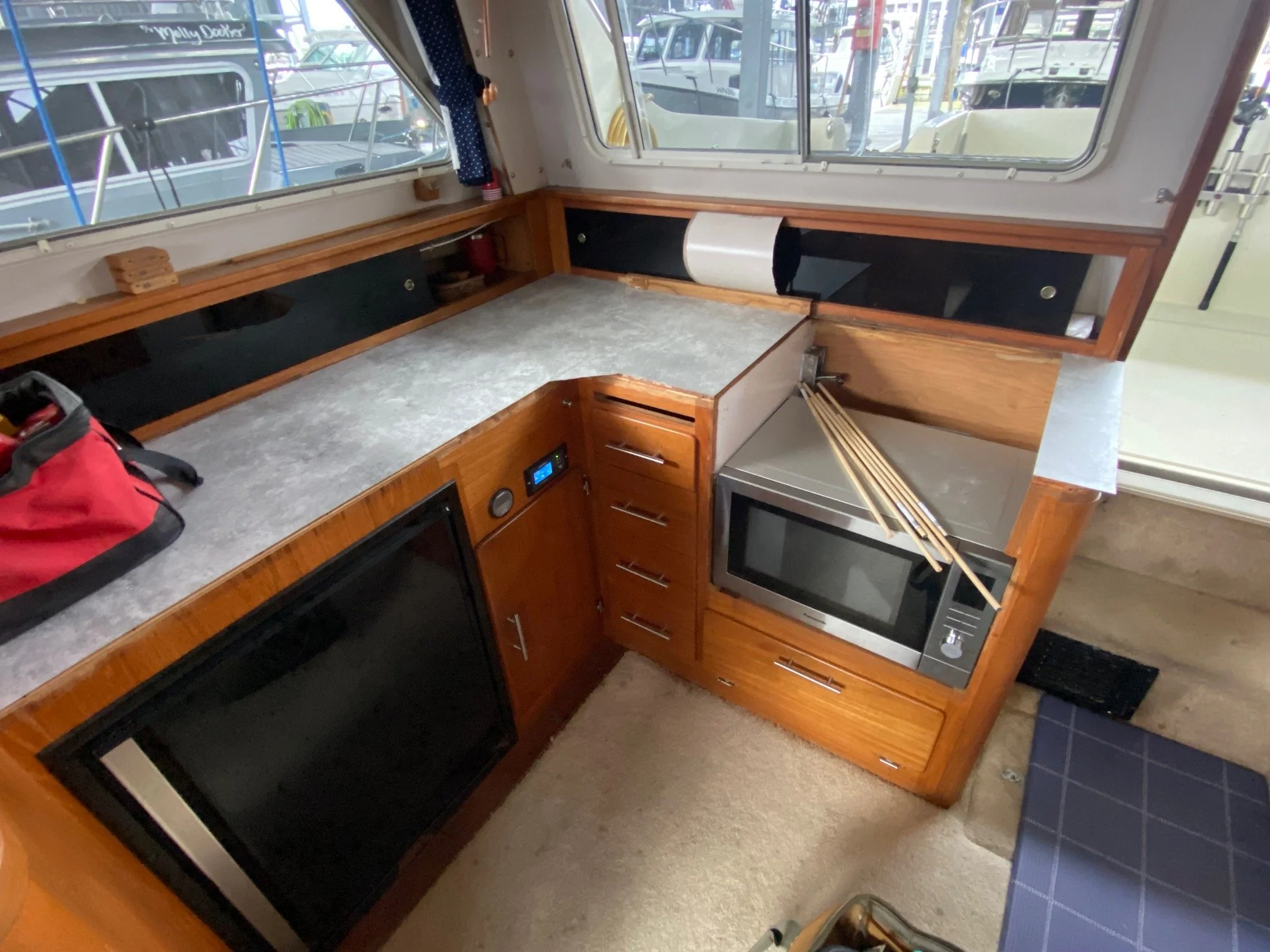 A local boat owner asked if I could overlay the laminate in his galley. Plugged and screwed teak was removed and reinstalled once the new countertop was in place, and finished with teak oil.